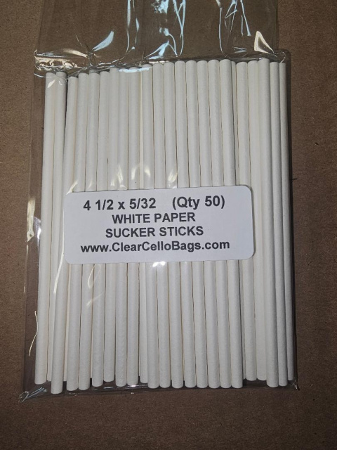 4 1/2 x 5/32 WHITE PAPER SUCKER STICKS (Qty 50) White paper sucker sticks are made of densely wound paper.
